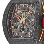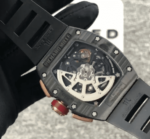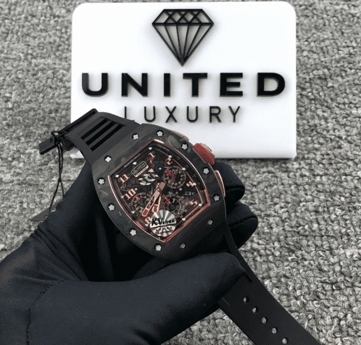 The Richard Mille RM011 Romain Lotus F1 Rose Gold NTPT Carbon Replica is a luxurious watch with a unique design. The watch features an automatic movement with a 7750 caliber and a power reserve of 60 hours. It is certified within COSC limits for precision and has a sweep motion second hand. The case is made of carbon and is black in color. with a carbon bezel of the same color. The crystal is sapphire and the size is 50.00 mm. The bracelet is made of rubber and is adjustable for all sizes. with a 904L stainless steel double-fold clasp.