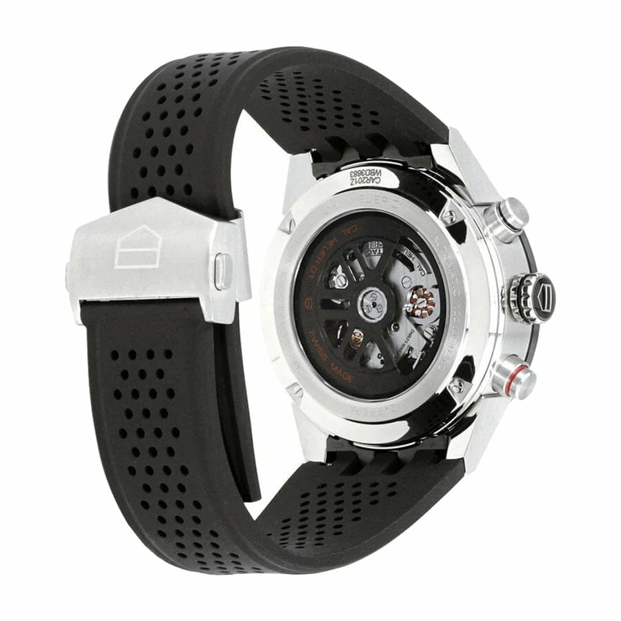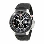 The TAG Heuer Carrera CAR201Z.FT6046 Black Rubber Replica is a striking watch. It features a 904L stainless steel case with a black bezel and sapphire crystal. The movement is an automatic TAG Heuer caliber Calibre Heuer 01 with a 60-hour power reserve and precision of -3/+3 sec/day within COSC certification limits. The second hand has a sweep motion.